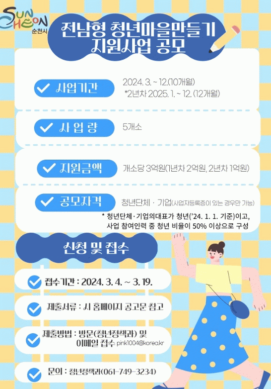 청년마을 만들기 사업에 관심 있는 청년단체·기업은 시 홈페이지에 게시된 공고문을 참고하여 오는 19일까지 순천시 청년정책과로 사업계획서를 제출하면 된다.