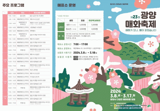 올해로 제23회를 맞는 광양매화축제는 오는 8일부터 17일까지 열흘간 ‘광양 매화, K-문화를 담다’를 주제로 광양매화축제에서만 즐길 수 있는 차별화된 콘텐츠로 관광객을 맞는다.
