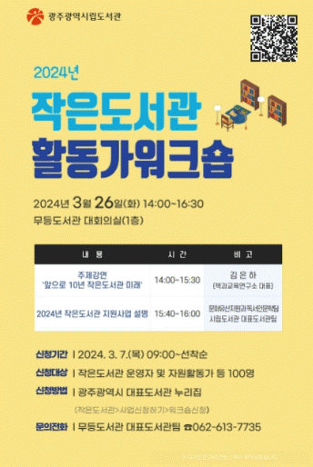 이번 워크숍은 ▲주제 강연 ‘앞으로 10년 작은도서관의 미래’ ▲2024년 작은도서관 활성화 지원사업 설명 ▲2024년 작은도서관 지원센터 사업 안내 등으로 진행돼 활동가 간 정보를 공유하고 소통하는 시간이 될 것으로 기대된다.