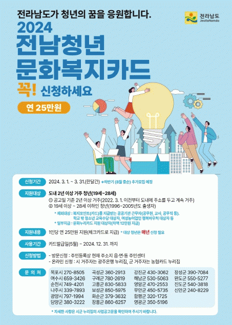 전남청년문화복지카드는 도서, 영화, 공연, 학원수강, 체육시설 이용 등 문화 활동 및 자기계발을 위한 업종에서 사용 가능하며, 농협카드 누리집과 주소지 읍?면사무소에서 방문 신청할 수 있다.