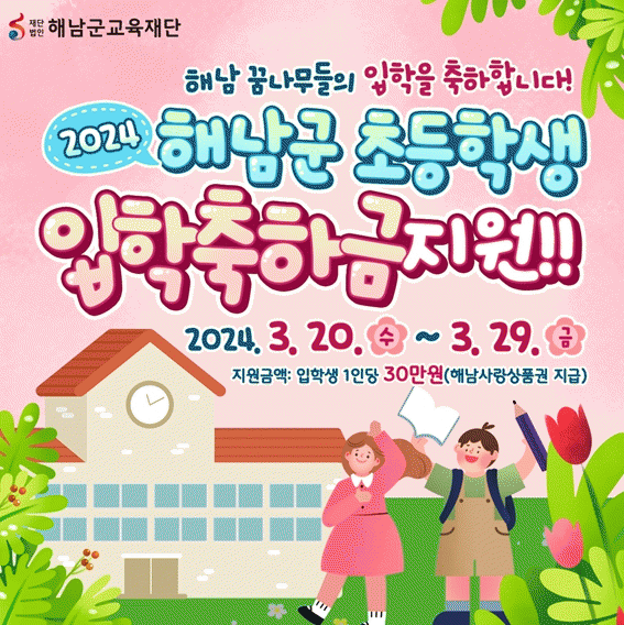 대상은 올해 초등학교를 입학한 신입생으로 각 30만원을 해남사랑상품권으로 지급한다.