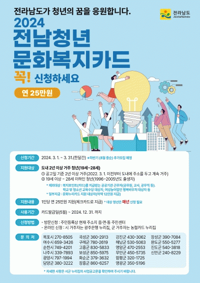 공연 관람, 학원 수강, 도서 구입 등 청년의 문화생활 향유 및 자기계발 기회 제공을 위한 지원사업은, 신청일 현재 2년 이상 전남에 거주하고 있는 19~28세가 참여할 수 있고, 연 25만원의 문화복지비를 지원하는 내용.