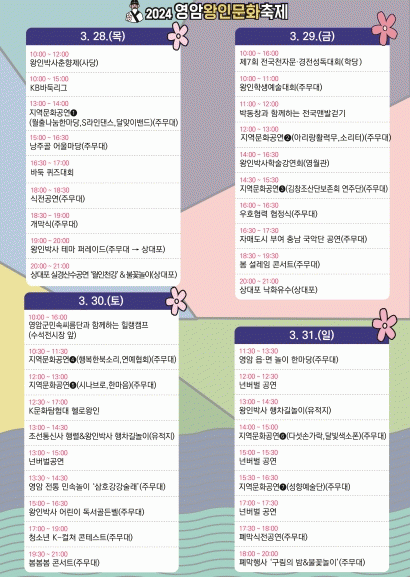 2024 영암왕인문화축제가 3월28일 개막한다. 영암군향토축제추진위원회에 따르면 오는 31일까지 ‘시공초월 : 왕인의 문화, 빛이 되다’을 주제로 나흘동안 왕인박사유적지에서 상대포와 구림마을 일원에서 펼쳐지고 “새로운 축제도시로서의 ‘빛’이나는 시작을 열다!”라는 컨셉으로 진행할 예정이다! 영암군과 영암문화관광재단은 24~25 대한민국 문화관광축제 및 24 전라남도 우수축제 선정 계기를 통해 최근 축제 트렌드에 맞는 프로그램을 반영하고 인물에서 인문으로 변화해가는 콘텐츠 축제로 변화하는 프로그램을 준비하고 있다.