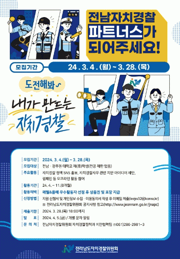 조만형 전남도자치경찰위원장은 “파트너스는 엠지(MZ)세대의 반짝이는 아이디어를 활용한 정책 발굴 및 홍보를 통해 자치경찰을 알리는 큰 역할을 하고 있다”며 “자치경찰 발전을 선도할 지역 대학생의 많은 참여 바란다”고 당부했다.