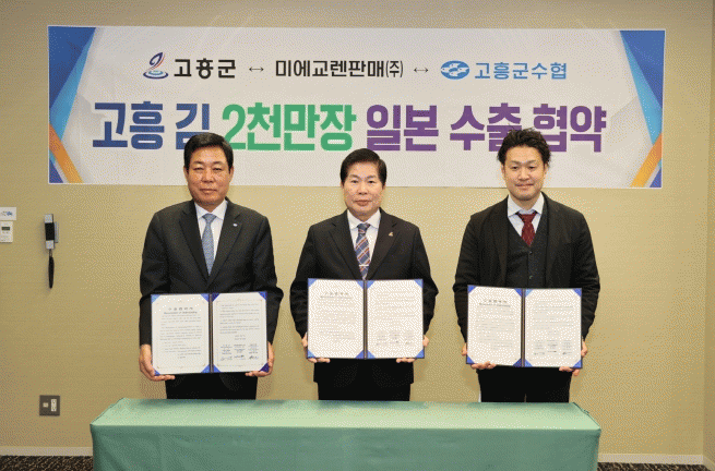이번 수출협약은 고흥군-고흥군수협-일본 미에교렌판매(주)의 3자 간 지속적인 교류 및 협력체계를 구축해 고흥 김의 일본 수출 및 일본 내 유통 확대를 위해 이뤄졌다.
