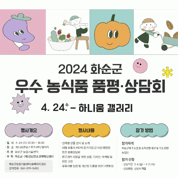 이번 품평회는 화순군농업기술센터와 전라남도 창조·경제혁신센터에서 공동으로 진행하며, 화순군에 주소를 둔 농업경영체를 대상으로 한다.