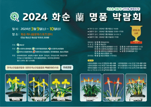 군이 주최하고 (사)한국난문화협회와 화순난연합회 등 7개 단체 공동주관으로 열리는 이번 박람회는 한국 자생란 교류의 장으로 소심, 주금화, 홍화 등 1,000여 분의 출품작을 무료로 만날 수 있다.