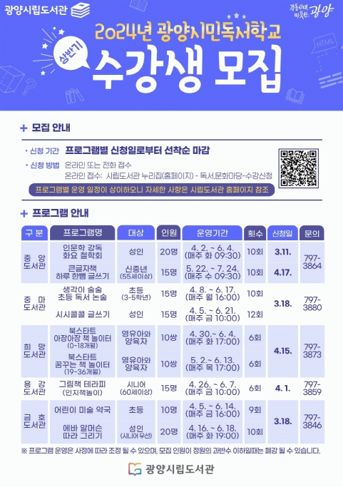 참여를 희망하는 시민들은 프로그램별 모집 일정에 맞춰 광양시립도서관 누리집에서 신청하면 된다. 프로그램에 대한 세부 내용은 시립도서관 누리집을 통하거나 각 도서관에 문의하면 자세히 안내받을 수 있다.