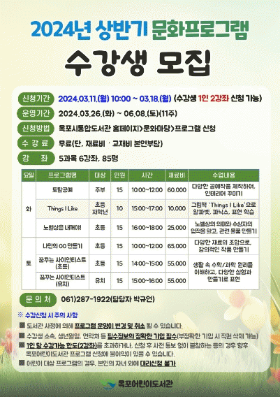 참가 신청은 오는 11일부터 목포시통합도서관 홈페이지에서 가능하며, 참가비는 무료(재료비 별도)이다.