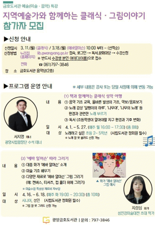 이번 특강은 ▲초등학생 대상 '책과 함께하는 클래식 성악 여행'(4. 1. 부터 5. 27., 매주 월요일) ▲시니어 및 성인 대상 '에바 알머슨 따라 그리기'(4. 16. 부터 6. 18. 매주 화요일) 등 2개 강좌로 운영되며, 누구나 쉽고 즐겁게 음악과 미술을 접할 수 있는 특별한 시간이 될 것으로 기대된다.