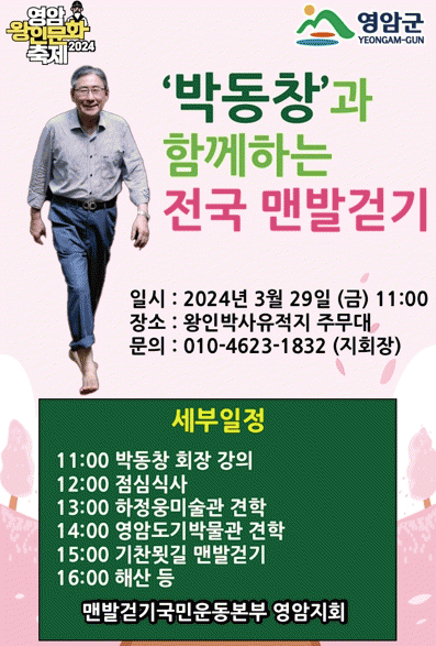 박 회장은 행사장에서 맨발 걷기의 효과와 즐거움, 안전하게 걷는 법 등을 알리고, 참가자들과 벚꽃 만발한 기찬묏길을 걸을 예정이다.