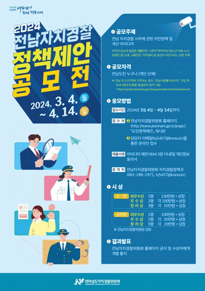 응모 분야는 ▲생활안전 ▲여성·청소년·아동·노인·장애인 등 사회적 약자 보호 ▲교통안전 ▲지역 경비 등 일상의 치안 서비스다. 전남도민이면 누구나 응모할 수 있다. 주소지가 전남이 아닌 경우에도 전남사랑애(愛) 서포터즈 가입을 통해 전남사랑도민증을 발급받으면 참여 가능하다.