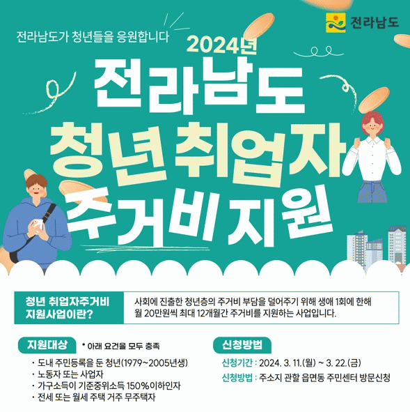 지원 대상은 무주택자로서 신청일 현재 전남에 주소를 두고 전세 5천만 원 이상 또는 월세 60만 원 이하의 주택을 임차해 거주 중인 일하는 청년(1979~2005년 출생자)이다.