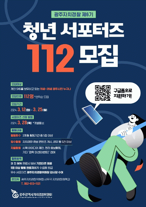 김태봉 광주자치경찰위원장은 “지역 청년들이 시책 홍보에 적극 참여해 지역 치안 강화와 광주자치경찰 인지도 제고에 기여하고 있다”며 “지역 청년들의 창의적인 아이디어와 다양한 재능을 적극 활용해 안전한 광주를 조성하는데 최선을 다하겠다”고 말했다.