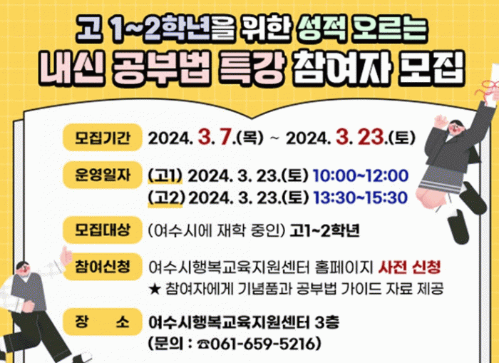 참석을 희망하는 학생은 여수시행복교육지원센터 홈페이지 에서 사전 신청 후 참석할 수 있으며, 모든 참석자는 코넬 노트와 공부법 가이드 자료도 제공받는다.