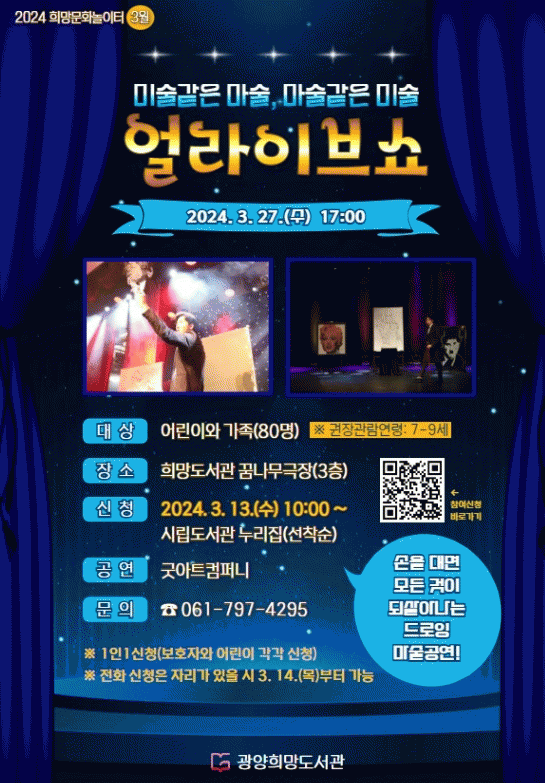‘얼라이브쇼’ 공연은 어린이와 가족 누구나 관람할 수 있으며, 참여를 희망하는 사람은 오는 13일 오전 10시부터 광양시립도서관 누리집에서 신청할 수 있다.