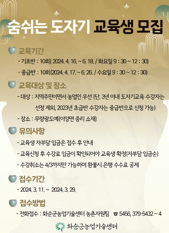 화순군농업기술센터 관계자는 “전통 생활문화 자원인 도예를 활용한 이번 교육을 통해 선조들의 장인정신을 배우는 동시에 부가 소득 창출 기회가 될 것으로 기대한다”라며 “도예 교육에 많은 관심과 참여를 당부한다”라고 말했다.