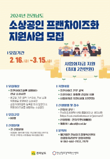 신청 자격은 모집 공고일 기준으로 1년 이상 전남에서 직영점을 운영 중이며, 공정거래위원회에 등록하지 않았으나 프랜차이즈화를 희망하는 소상공인이다.