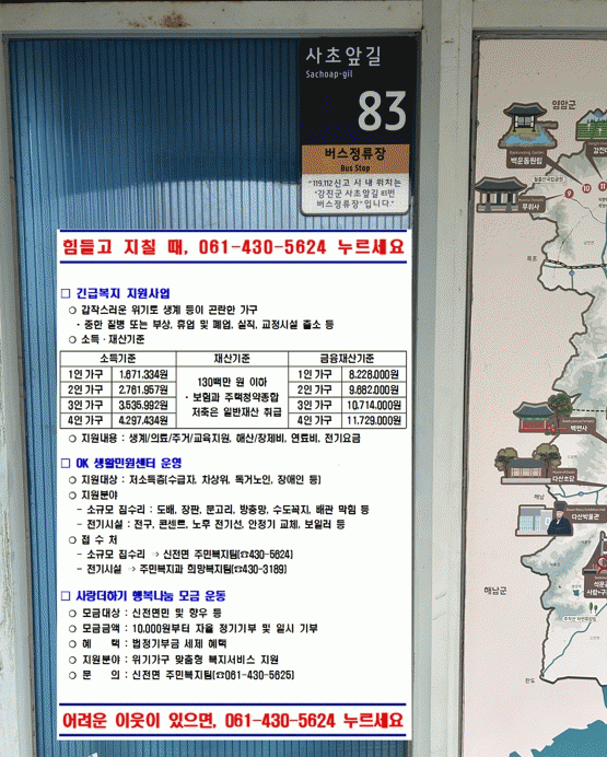 기존의 발굴 방법뿐만 아니라 대중교통을 이용하는 면민을 대상으로 버스정류장에 복지사각지대 발굴 포스터를 붙여 지인이나 가족들에게 말하지 못하거나, 주변에 어려운 이웃이 있을 때, 도움을 요청할 수 있게 ‘힘들고 지칠 때 061-430-5624 누르세요’, ‘어려운 이웃이 있으면 061-430-5624 누르세요’를 안내하고 있다.