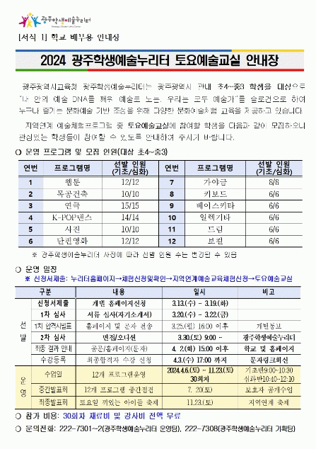 한편 토요예술교실은 오는 7월 수강생 보호자를 대상으로 공개수업을 진행할 예정이다. 또 11월 마지막 날에는 12개 프로그램의 성과 발표인 ‘토요일 끼있는 아이들 축제’가 진행돼 공연과 전시, 부스체험 등을 운영한다.