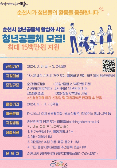 지원 대상은 순천시에서 거주 또는 활동하고 있는 18세 부터 45세로 구성된 5인 이상 청년 공동체이며, 순천시에 주민등록 주소를 둔 청년 비율이 60% 이상이어야 한다.