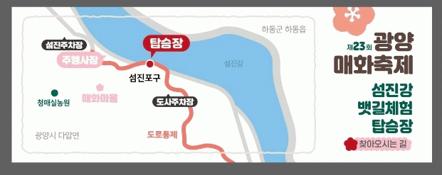 축제 기간 매일 오전 10시부터 오후 4시까지 운영되는 섬진강 뱃길 체험은 수월정 인근 섬진포구에서 탑승해 20여 분 동안 매화꽃 흩날리는 섬진강을 즐길 수 있다.
