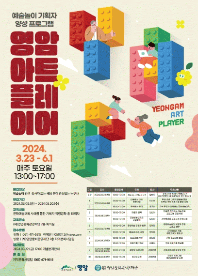 ‘영암아트플레이어YAP’신청은 오는 3월 20일 오후 6시까지며, 지역에서 예술놀이 기획과 운영에 관심 있는 영암군민 20인을 모집한다.