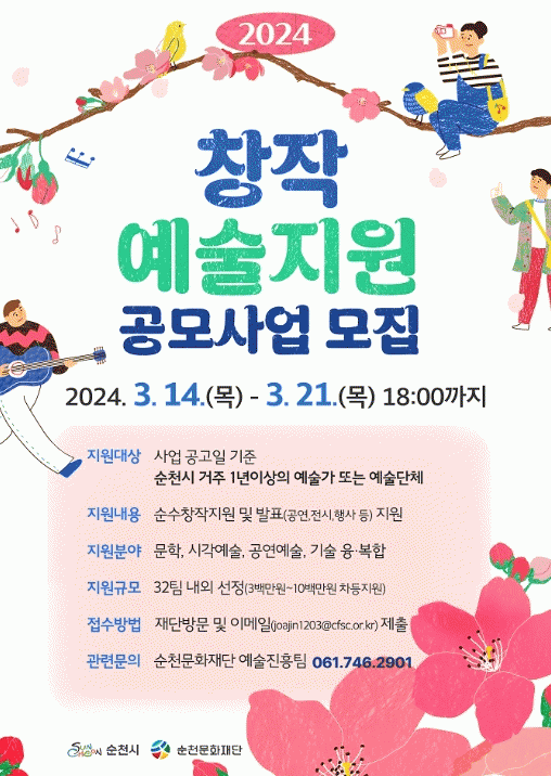 보다 자세한 내용은 순천문화재단 누리집공고문에서 확인할 수 있으며, 순천문화재단 예술진흥팀으로 문의하면 된다.