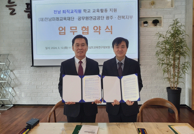 두 기관은 협약에 따라 △ 전남 퇴직 교직원 교육지원 봉사센터 사업 홍보 △ 퇴직 전·후 교직원의 전문성 강화 △ 자격증 취득 기회 제공 등에 힘을 모으기로 했다.