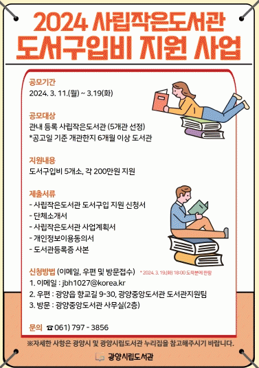 지원 대상은 공고일 6개월 이전 광양시에 등록한 사립작은도서관이며, 기존에 사업 참여를 하지 않은 작은도서관의 경우 가산점이 부여된다.