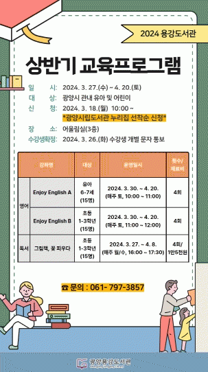 프로그램 수강 신청과 기타 자세한 사항은 광양시립도서관 누리집을 방문하거나 용강도서관으로 문의하면 된다.