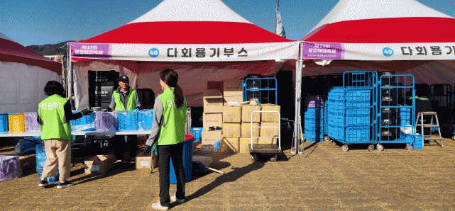 음식 부스에서는 다회용기에 음식을 제공하고 방문객들은 다회용기 부스에서 음식 찌꺼기 및 쓰레기 등을 분리수거한 후 접시, 컵, 밥그릇 등을 종류별로 반납해야 한다.