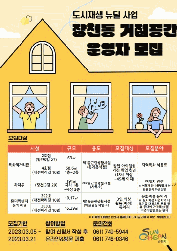 신청방법은 순천시홈페이지 고시·공고란에 게시된 구비서류를 갖추어 도시공간재생과 또는 장천현장지원센터에 방문하여 신청하거나 전자우편을 통해 가능하며, 1차 서류심사와 2차 면접심사를 통해 최종 운영자가 선정된다.