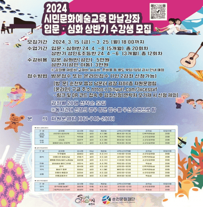 이번 강좌에 참여를 원하는 시민은 순천문화재단 누리집에서 온라인 신청하거나 순천문화재단(남문터광장 지하 1층 자원운영팀)으로 방문하면 된다.