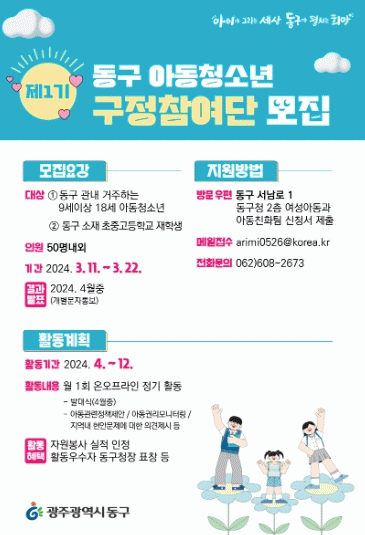 ‘동구 아동·청소년 구정 참여단’은 ▲아동친화도시 조성 사업 발굴 ▲아동 권리 모니터링 ▲아동 권리 현안·주민행정서비스 등에 대한 정책 제안 ▲아동 친화적 지역문화 확산을 위한 홍보활동 등을 통해 실질적이고 지속가능한 아동친화도시 동구 조성에 기여할 것을 목표로 한다.