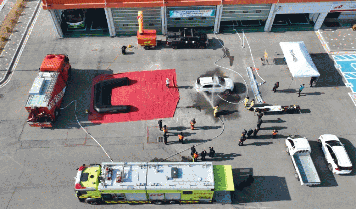 최근 사회적으로 대두되고 있는 전기차 화재에 대한 대응 능력을 강화하기 위해 지진으로 인한 전기차 화재 상황을 가정해 인명 구조 및 복합재난 훈련을 진행했다.
