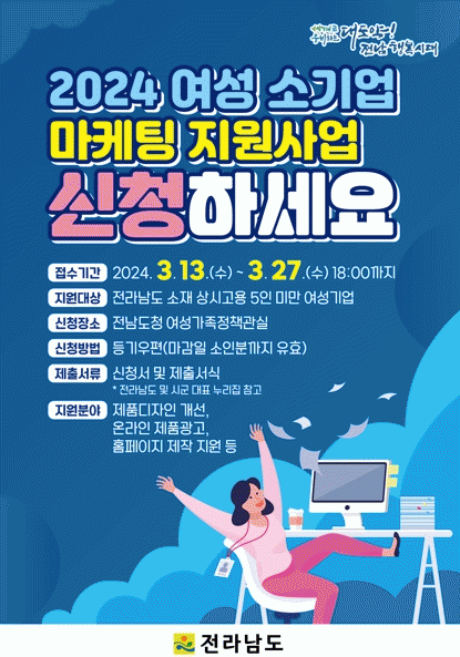 신청 자격은 여성이 대표자로 주 사업장을 전남에 두고 있는 상시 고용인력 5인 미만인 기업이다. 자세한 사항은 전남도 누리집을 통해 확인 후 등기우편이나 전자우편으로 접수하면 된다.