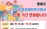 담양 전향윤 기자2025. 10.16[뉴스맘]영광군은 전 군민에게 50만 원(2차분)을 지급하는 민생경제회복지원금 신청 기간을 10월 31일까지 2주 더 연장한다. 2차 민생경제회복지원금은 지난 9월 1일부터 10월 15일까지 49,230명에게 246억 원이 지급됐고, 1차 민생경제회복지원금 신청 대비 미신청자가 많은 것으로 나타났다. 이와 관련하여 군은 군민들 중 출타로 인한 부재, 민생회복 소비쿠폰과 신청기간(9. 22.∼10. 31.)을 혼동하여 신청하지 못하는 사례가 있음을 반영하여 지원금을 신청하지 못한 군민들이 혜택을 빠짐없이 받을 수 있도록 신청을 연…