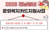 무안 전향윤 기자2026. 03.12[뉴스맘]무안군은 청년의 문화생활과 자기계발을 지원하기 위해 ‘2026년 전남 청년 문화복지카드 지원사업’ 대상자를 모집하고 있다고 밝혔다. 올 2월 한 달간 접수 결과 방문 신청 170건, 온라인 신청 2,075건 등 총 2,245건이 접수됐으며, 군은 아직 신청하지 못한 청년들이 지원을 받을 수 있도록 3월 말까지 추가 접수를 진행할 예정이다. 지원 대상은 2024년 2월 9일 이전부터 전라남도에 주소를 두고 무안군에 2년 이상 거주한 19세부터 28세까지(1998~2007년 출생) 청년이다. 대상자로 선정되면 1인당 연…