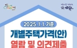 경제 전향윤 기자2025. 03.24[뉴스맘]순천시는 1월 1일 기준 개별주택 가격에 대한 열람 및 의견제출 기간을 4월 9일까지 운영한다고 밝혔다. 이번에 열람 대상 개별주택은 32,389호로, 개별주택 특성 등을 조사해 산정했으며, 가격의 공정성과 객관성을 높이기 위해 한국부동산원(순천지사)의 산정가격 적정성 여부 등의 검증 절차를 마쳤다. 개별주택 가격의 열람은 세정과 및 읍면동 행정복지센터를 방문하거나 순천시 누리집 및 부동산공시가격알리미를 통해 확인할 수 있다. 열람가격에 의견이 있는 소유자 및 이해관계자는 의견서를 작성하여 세정과 및 읍면동 행정복지센…