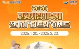 해남 전향윤 기자2026. 01.21[뉴스맘]장흥군은 설 명절을 앞두고 고향사랑기부제 활성화를 위해 1월 20일부터 2월 20일까지 ‘2026 설맞이 고향사랑기부제 더 드림 이벤트’를 진행한다. 이벤트 기간 중 ‘고향사랑e음’을 통해 장흥군에 10만 원 이상 기부하면 별도의 신청 절차 없이 자동으로 이벤트에 응모된다. 해당 조건을 충족한 기부자 전원에게는 모바일 상품권 5,000원이 경품으로 제공된다. 또한 이벤트 종료 후에는 무작위 추첨을 통해 10명을 선정, 5,000원권 모바일 상품권을 추가로 증정하는 혜택도 마련돼 있어 최대 1만 원 상당의 경품을 받을 …