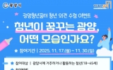 순천 전향윤 기자2025. 11.17[뉴스맘]광양청년꿈터가 11월 17일부터 11월 30일까지 ‘청년이 꿈꾸는 광양, 어떤 모습인가요?’를 주제로 청년 의견 수렴 이벤트를 진행한다. 이번 이벤트는 광양시 청년들의 다양한 목소리를 듣고, 청년이 바라는 광양의 미래상을 향후 청년정책과 프로그램 운영에 반영하기 위해 마련됐다. 참여 대상은 광양시에 거주하거나 광양시에서 활동하고 있는 18세~45세 이하 청년이다. 참여 방법은 광양청년꿈터 공식 SNS(네이버 블로그·인스타그램) 중 한 곳을 팔로우한 뒤, ‘청년이 바라는 광양의 모습’을 자유롭게 작성해 팔로우 인증과…