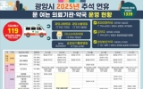 여수 전향윤 기자2025. 09.29[뉴스맘]광양시는 시민과 귀성객들이 안전하고 편안하게 명절을 보낼 수 있도록 오는 10월 3일부터 9일까지 7일간 ‘추석 연휴 종합상황실’을 운영한다고 밝혔다. 추석 연휴 종합상황실은 생활민원기동반, 재난상황반, 진료대책반 등 총 6개 반으로 편성되며 266명의 인력이 투입된다. 시는 각종 비상 상황에 신속하고 체계적으로 대응함으로써 시민들의 생활 불편을 최소화하고 안전을 확보할 계획이다. 생활민원기동반은 환경, 도로, 교통, 수도, 쓰레기 수거, 가로등 등 일상과 직결된 민원을 집중 처리해 연휴 기간 발생할 수 있는 불편을 신…
