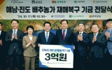 정치 전향윤 기자2024. 10.17[뉴스맘]전라남도는 17일 한국농어촌희망재단으로부터 9월 배추 호우피해 농가 복구를 위한 상생기금 3억 원을 기탁받았다고 밝혔다. 한국농어촌희망재단은 한국농수산물도매시장법인협회 가락시장지회(지회장 권장희) 회원사인 ▲서울청과(대표이사 권장희) ▲중앙청과(대표이사 이원석) ▲대아청과(대표이사 이상용) ▲동화청과(대표이사 홍성호) ▲농협가락공판장(장장 홍종호)이 출연한 상생기금을 활용해 농어촌 상생 발전을 위한 공익사업을 지원하는 단체다. 이날 전달식에는 김영록 전남도지사와 권장희 지회장을 포함한 4개 회원사 대표, 해남부군수, 진…