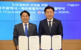 전남 전향윤 기자2024. 05.17[뉴스맘]광주와 제주가 민주평화와 교류 증진을 위해 손을 잡았다. 광주광역시와 제주특별자치도는 17일 오후 광주시청에서 강기정 시장과 오영훈 지사가 참석한 가운데 인권 평화와 번영을 위한 ‘상생발전 업무협약’을 체결했다. 이날 협약은 강기정 시장이 광주시장으로는 처음 참석한 제주 4·3희생자 추념식에서 ‘국가폭력에 희생된 4·3과 5·18의 진상규명 등을 위한 공동 협력’을 제안하고, 오영훈 지사가 이에 화답한 결과이다. 강 시장과 오 지사는 이날 5·18과 4·3을 상징하는 배지를 서로의 어깨깃에 채워주며 우호를 다지고 양 도…