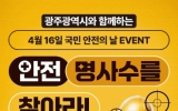 광주 전향윤 기자2024. 04.11[뉴스맘]광주광역시는 시민들의 안전에 대한 관심을 높이기 위해 오는 15일부터 21일까지 온라인 이벤트 ‘안전 명사수를 찾아라’를 진행한다. 이번 이벤트는 4월 16일 국민안전의 날을 맞아 국민안전주간(4월 15~21일)에 광주시 누리집 알림창 ‘안전 명사수를 찾아라!’를 통해 광주시민안전보험과 교통사고 예방 캠페인 동영상을 보고 관련 문제를 풀어 구글 폼에 답을 입력하면 된다. 광주시는 25일 오후 5시 참여자 중 추첨을 통해 416명을 무작위로 추첨해 음료쿠폰을 선물로 증정한다. 국민안전의 날은 세월호 참사 사건을 계기로 …