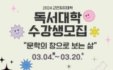 강진 전향윤 기자2024. 03.05[뉴스맘]강진군도서관이 2024년 독서대학 신입생을 모집한다. 독서대학은 군민 평생교육과 취미생활 및 건전한 여가선용 기회를 제공하고 독서문화를 생활화하기 위해 마련됐다. 올해는 ‘문학의 창으로 보는 삶’이라는 주제로 4월 11일부터 11월 14일까지 매월 2회, 목요일 저녁 7시에 도서관 3층 어울림방에서 운영된다. 접수는 3월 20일까지이며, 문학에 관심이 있는 군민은 누구나 신청이 가능하다. 신청서를 작성해 도서관 1층 종합자료실에 제출하거나, 이메일로 접수하면 된다. 강의 일정 및 운영에 관련된 자세한 사항은…