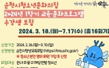 사회 전향윤 기자2024. 02.21[뉴스맘](재)순천문화재단은 오는 28일까지 ‘2024 시민문화예술교육 만날강좌’ 강사를 공개 모집한다고 밝혔다. ‘시민문화예술교육 만날강좌’는 지역 예술인 강사들의 다양한 예술교육을 통해 시민의식 고취와 문화적 공공성 함양에 목적을 두고 있다. 올해 입문·심화반은 시민들에게 보다 실생활에서 유용하게 활용할 수 있는 인문소양, 공연(시각)예술, 3D 소프트웨어, 문화예술교육 강좌를 개설했다. 모집분야는 입문·심화반, 상반기 강좌를 포함해 총 14명을 선정한다. 지원자격은 공고일 기준 이전 순천시 거주자로 관련학과 전공 졸…