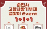 문화 전향윤 기자2024. 01.26[뉴스맘]순천시는 우리 고유의 대명절 설을 맞아 오는 29일부터 2월 7일까지 ‘순천 고향사랑기부제 1+1+1 이벤트’를 진행한다고 밝혔다. 이벤트 기간 중 고향사랑e음 사이트 또는 NH농협을 방문하여 순천시에 10만원 이상 기부하고 답례품 주문까지 완료하면 자동으로 응모된다. 이벤트에 당첨된 기부자는 세액공제 혜택(10만원 전액 세액공제 및 초과분 16.5%공제), 답례품 선택(기부액의 30%)과 더불어 순천사랑상품권 3만원(추첨)까지 추가로 받을 수 있다. 당첨자 발표는 기부일 익일 개별 공지되며 총 50명에게 제공될 예정이…