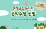고흥 전향윤 기자2024. 01.23[뉴스맘] 보성군은 오는 2월 23일까지 관내 농어업·임업 종사자를 대상으로 ‘2024년 농어민 공익수당’ 신청을 받는다고 밝혔다. 신청은 오는 2월 23일까지 경영체 등록부 등 필요 서류를 구비해 주소지 읍면 행정복지센터(면사무소)에서 방문 신청 가능하다. 보성군은 신청자의 자격 여부 확인을 거쳐 4월부터 60만 원 상당의 ‘정책 발행용 보성사랑상품권’을 지급할 예정이다. ‘정책 발행용 보성사랑상품권’은 연매출액 30억 초과한 사업장(농협하나로마트 등)에서도 사용할 수 있다. 농어민 공익수당은 1가구당 연 …